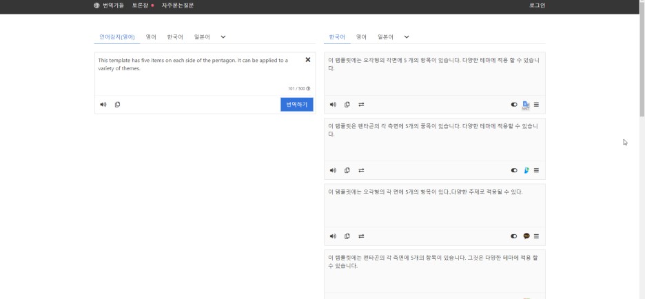 언어를 붙여넣기를 하면 언어 감지를 해서 알아서 번역을 모든 번역 사이트에서 번역이 됩니다만 몇몇 사이트는 200자 제한 등이 있기 때문에 끊어서 번역을 해야 하는 단점이 있습니다.