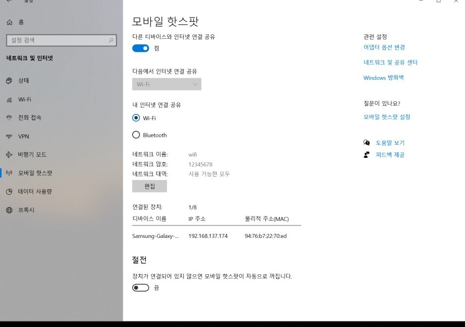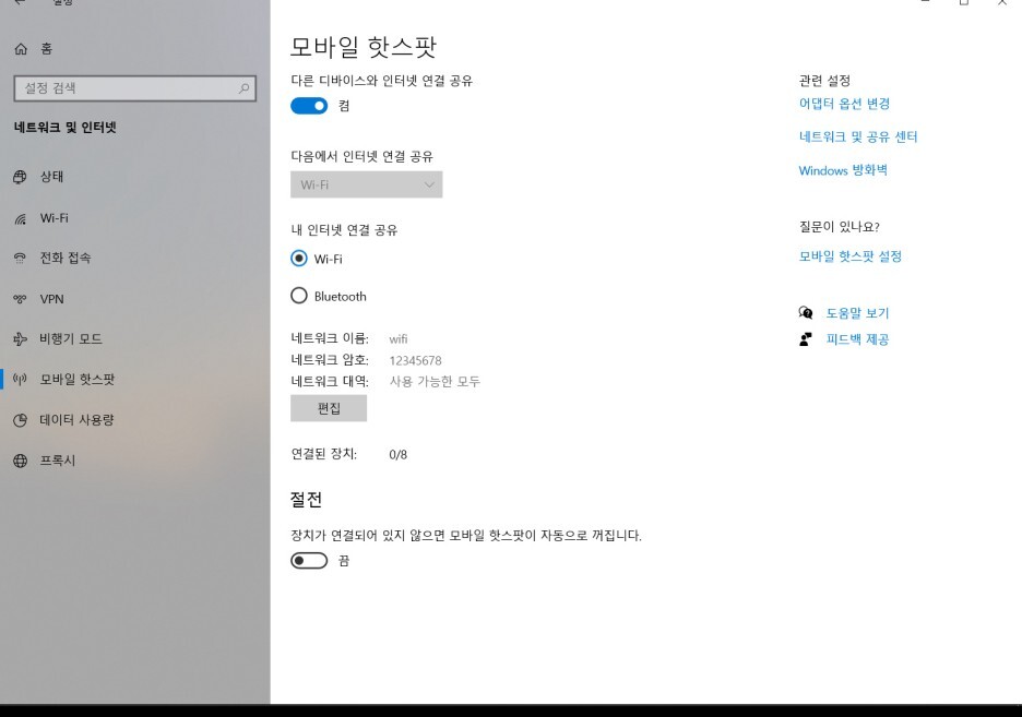 연결이 된 모습입니다. 모바일 핫스팟을 자주 사용하신다면 아래 절전은 끔으로 해주세요.