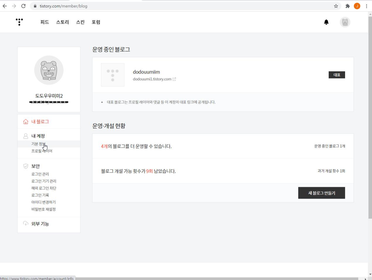 요약 - 티스토리에서 Q -> 계정관리 -> 기본 계정 -> 탈퇴하기 ->이메일 인증