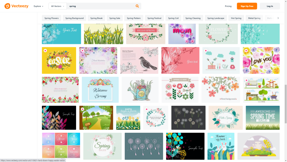 한글 검색을 지원하지 않기 때문에 영어로 검색하셔야 합니다. 아래는 SPIRING으로 검색했을 때의 일러스트인데 11시 방향에 빨간 별 모양은 유료이며 없는 게 무료라고 생각하시면 됩니다. 전체로 봤을 때 40% 정도가 유료라고 생각하시면 됩니다. FREEPIK에 비해 자료의 양은 적지만 그래도 특색이 있어서 같이 검색하시면 원하시는 일러스트를 충분히 구하실 수 있을 거라 생각합니다.