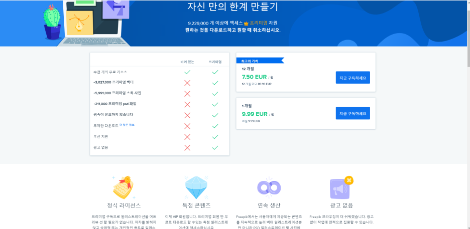 일러스트 사이트들은 부분 무료입니다. 유료 가입을 하게 되면 출처를 적지 않아도 되고 psd 파일과 더 많은 이미지를 제공합니다만 한 달에 10유로네요.