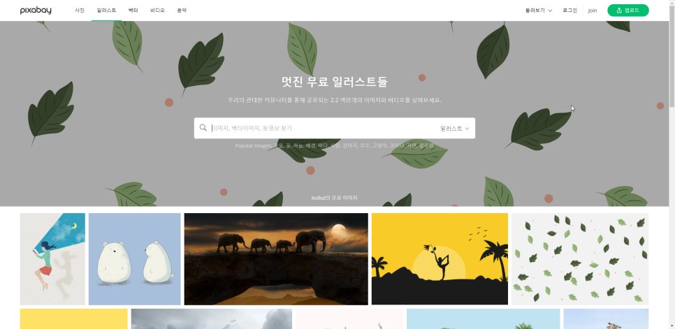 일러스트보다는 사진으로 유명한 사이트이지만 일러스트도 있습니다 자료가 많지는 않지만 상업적 사용이 가능하며 출처를 밝히지 않아도 되는 장점이 있습니다. 또한 한글로 검색이 되기 때문에 편하기도 합니다.