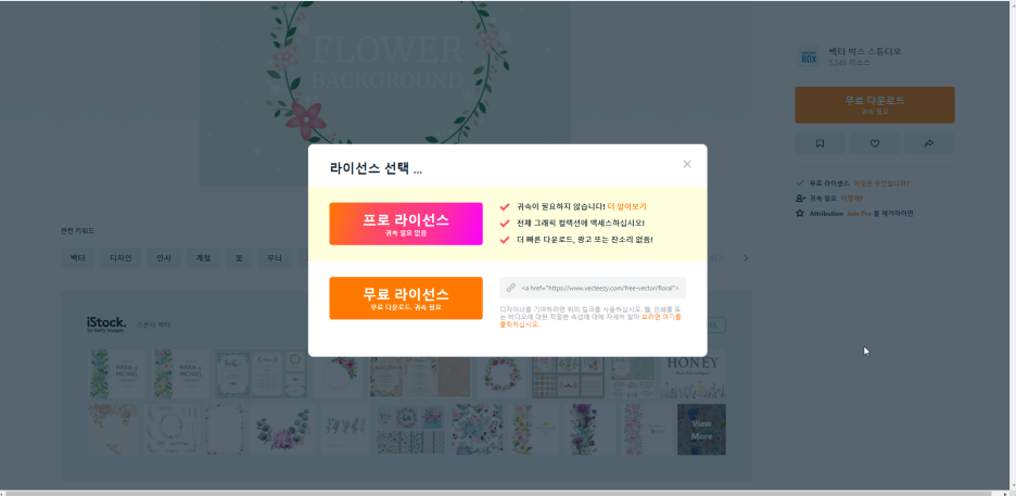 프리픽과 유사하게 프리미엄 유로와 무료 일러스트로 나누어져 있으며 무료 일러스트를 사용 시 항상 출처를 남겨야 합니다.