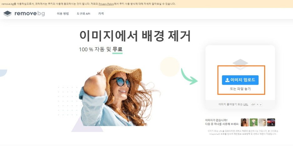 2. 이미지 업로드를 클릭하셔서 배경을 제거할 이미지를 업로드합니다. 시간은 5초 정도 걸립니다.