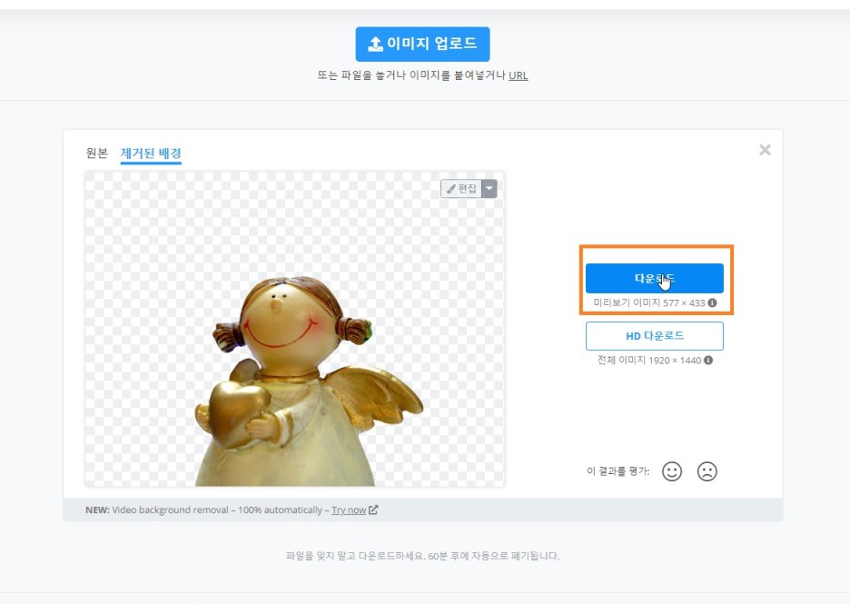 4. 바로 제거된 배경이 보이게 되며 그 상태로 다운로드를 클릭하시면 다운로드가 되게 됩니다. 아래 HD 다운로드는 유료이며 가입 시 무료로 2개 정도는 다운로드하실 수 있습니다.
