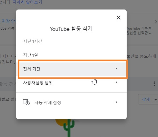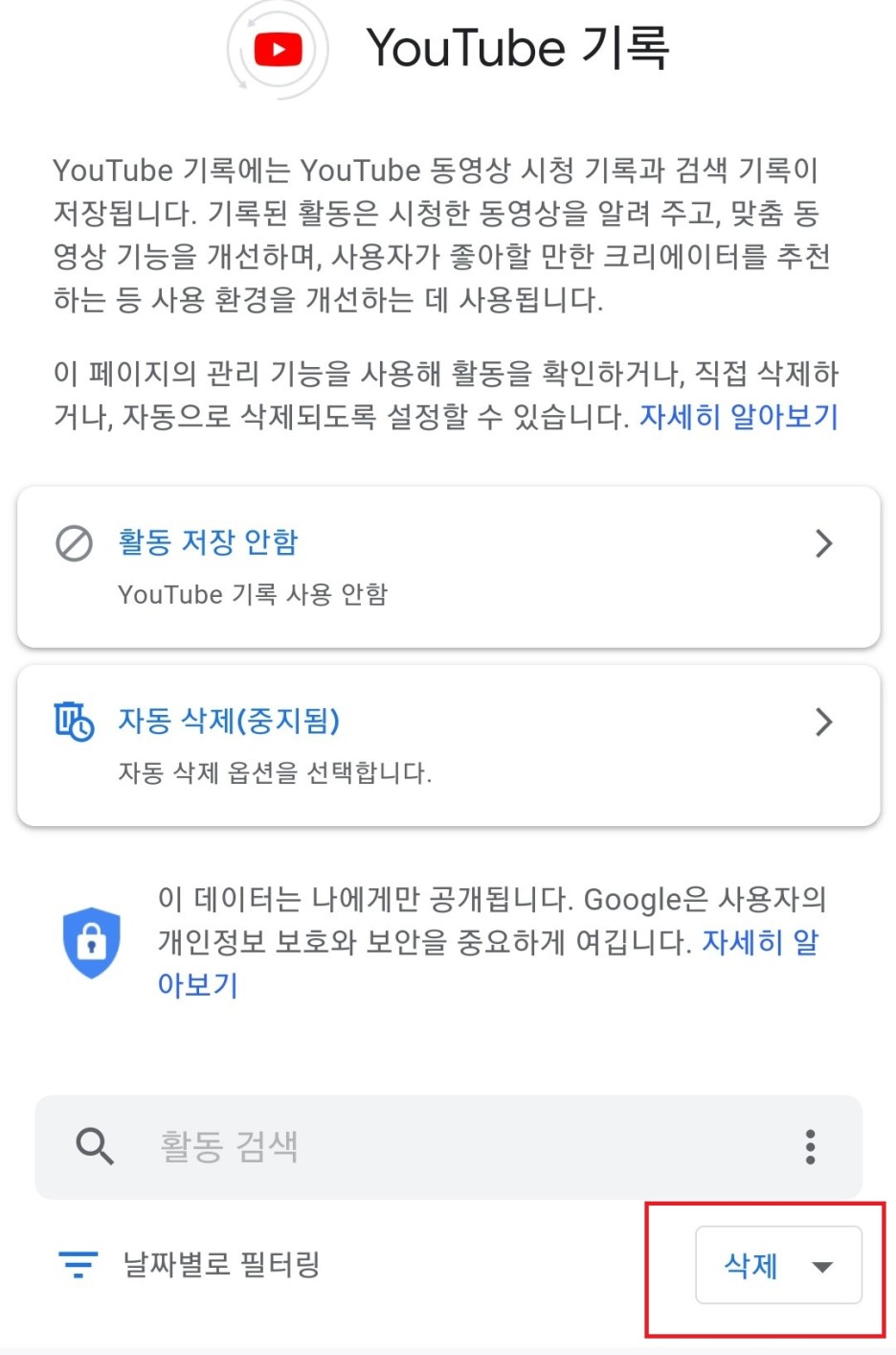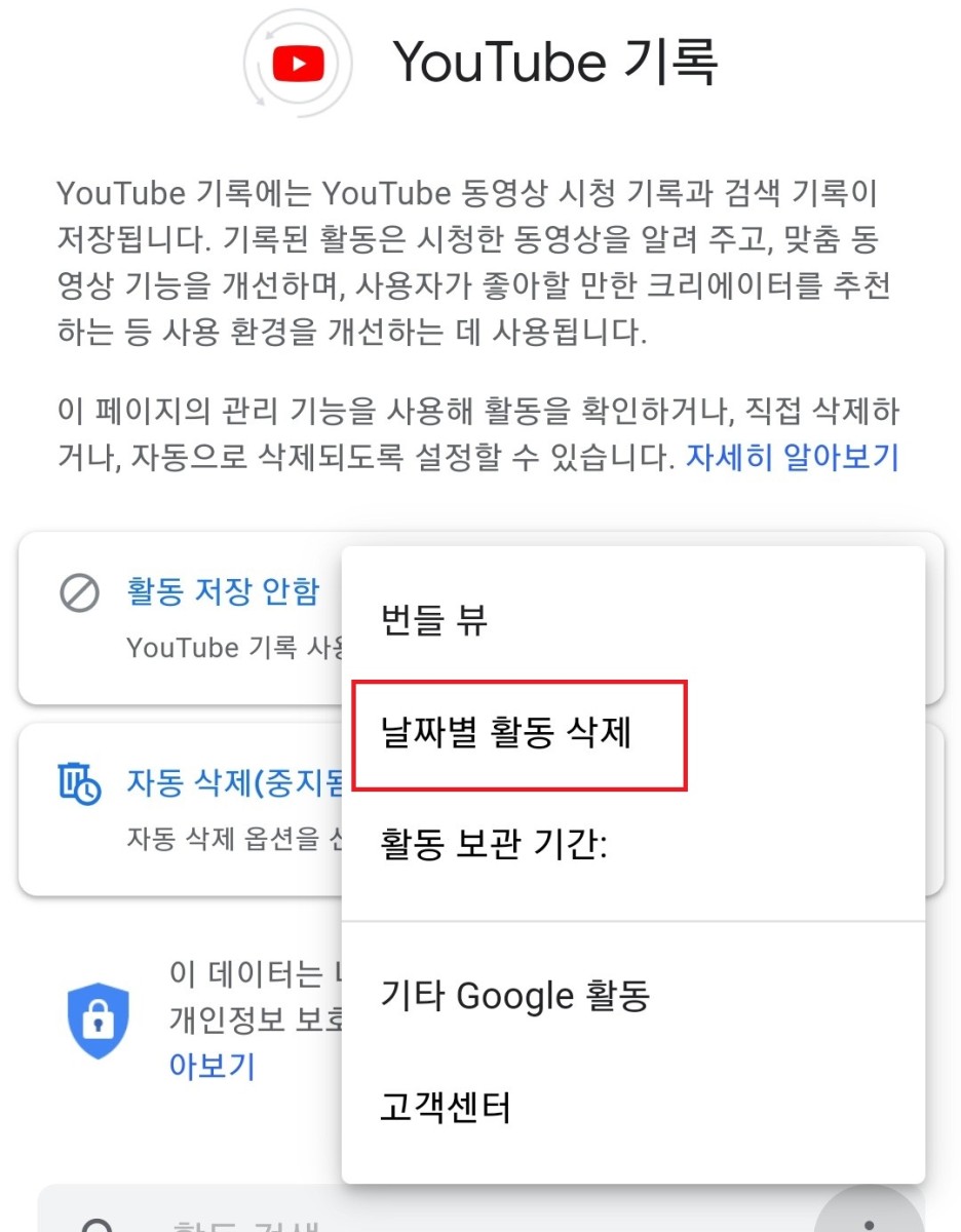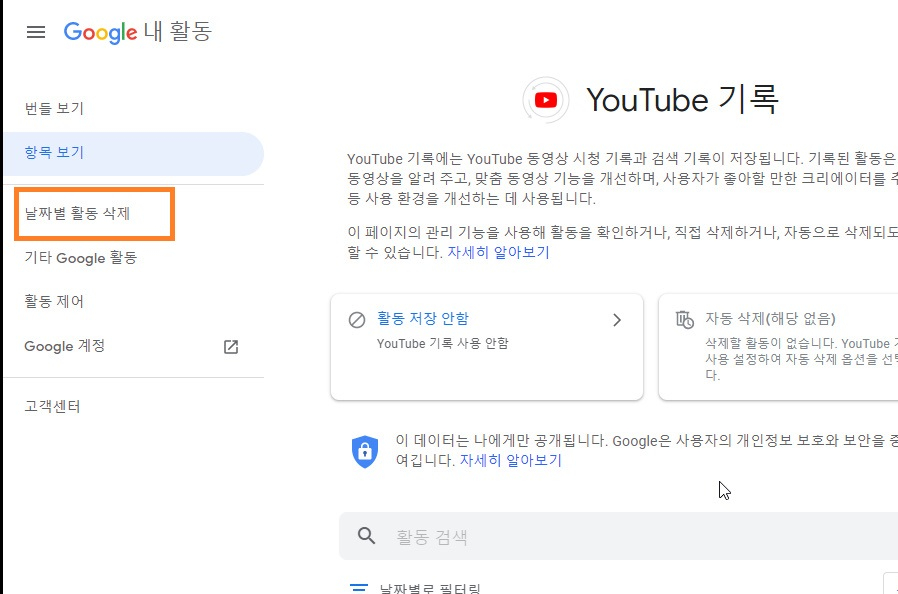 5. 왼쪽 카테고리에서 날짜별 활동 삭제 > 전체 기간을 클릭하시면 유튜브 검색 기록이 삭제됩니다.