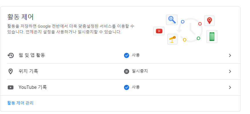4. 검색 기록을 지우기 위해서 활동 제어 하단에 활동 관리로 들어갑니다.