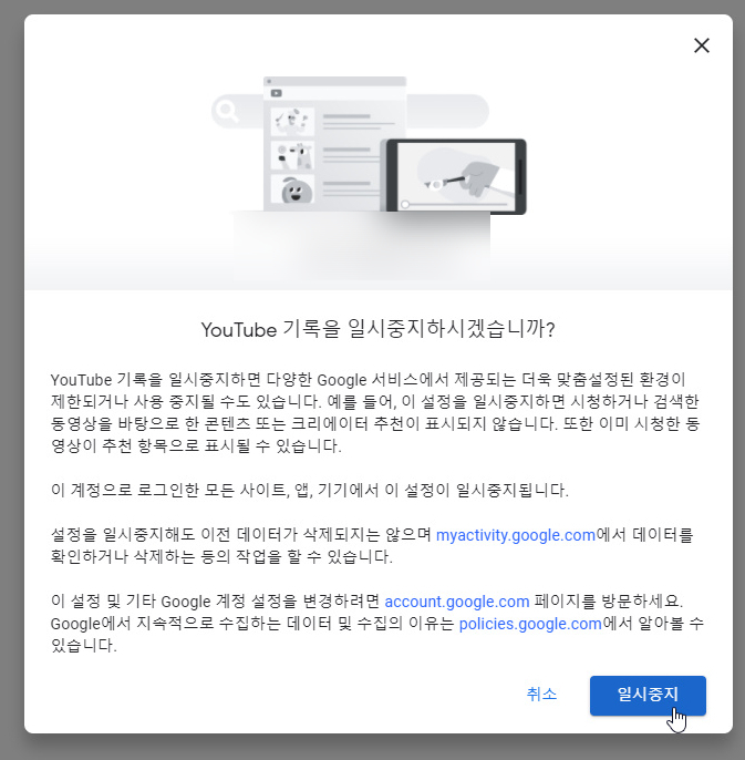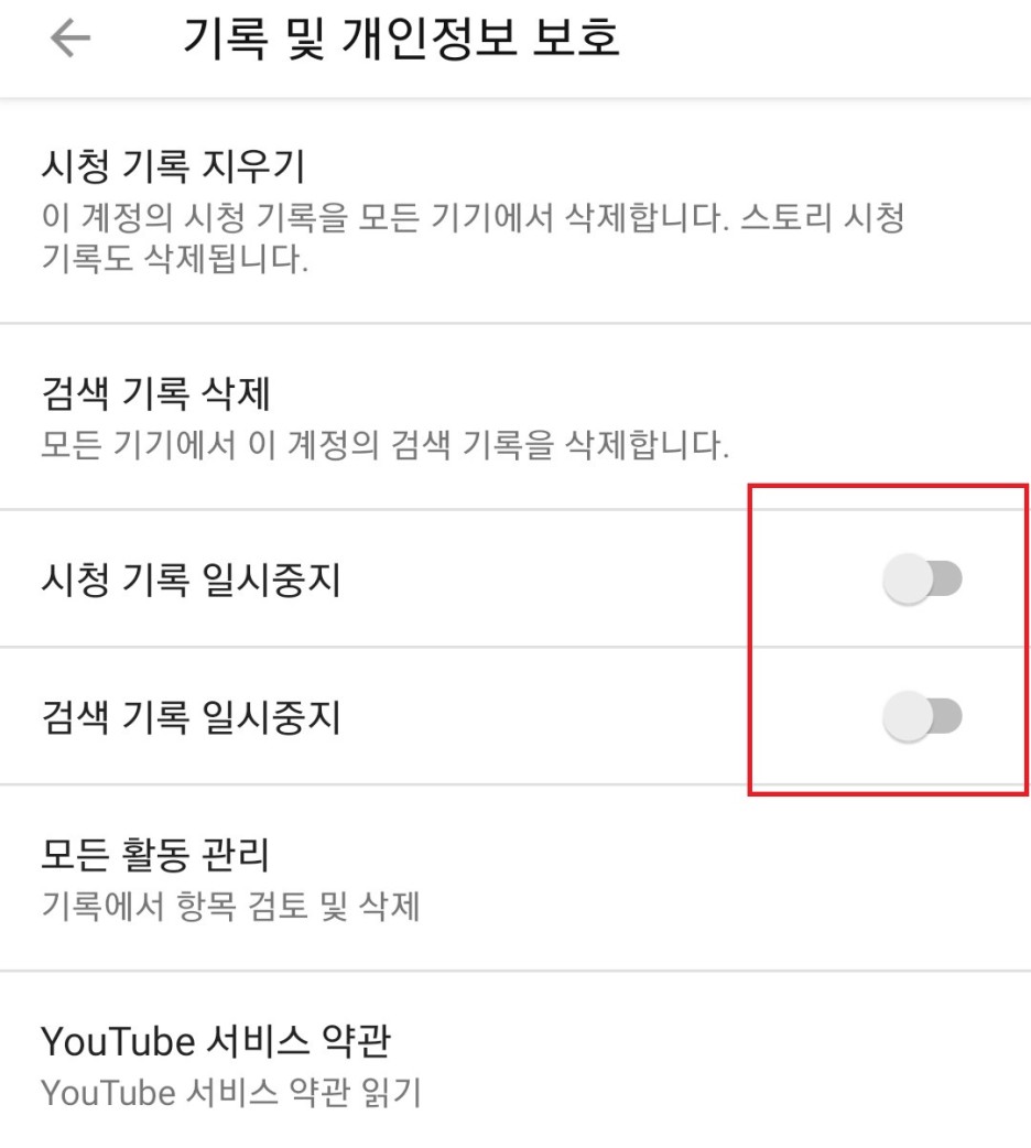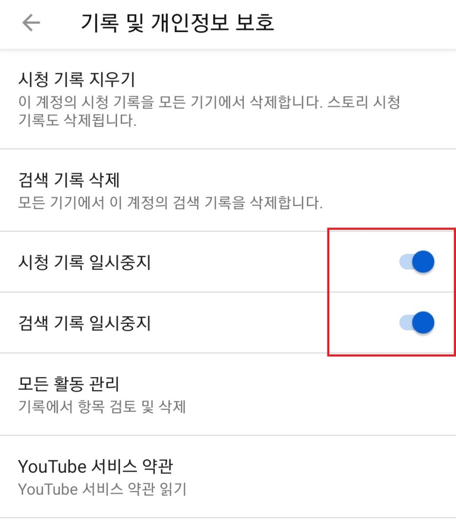 4. 아래 시청 기록, 검색 기록 일시 중지가 체크해제되어 있다면 오른쪽 사진처럼 체크해 주시면 되겠습니다.