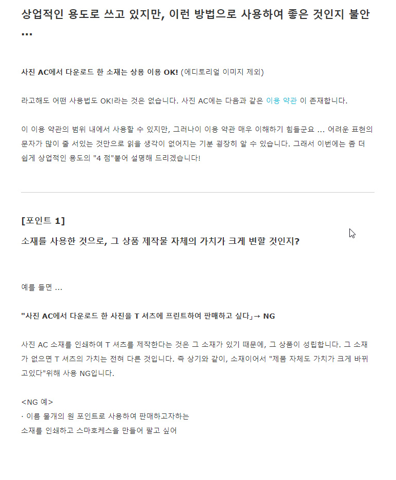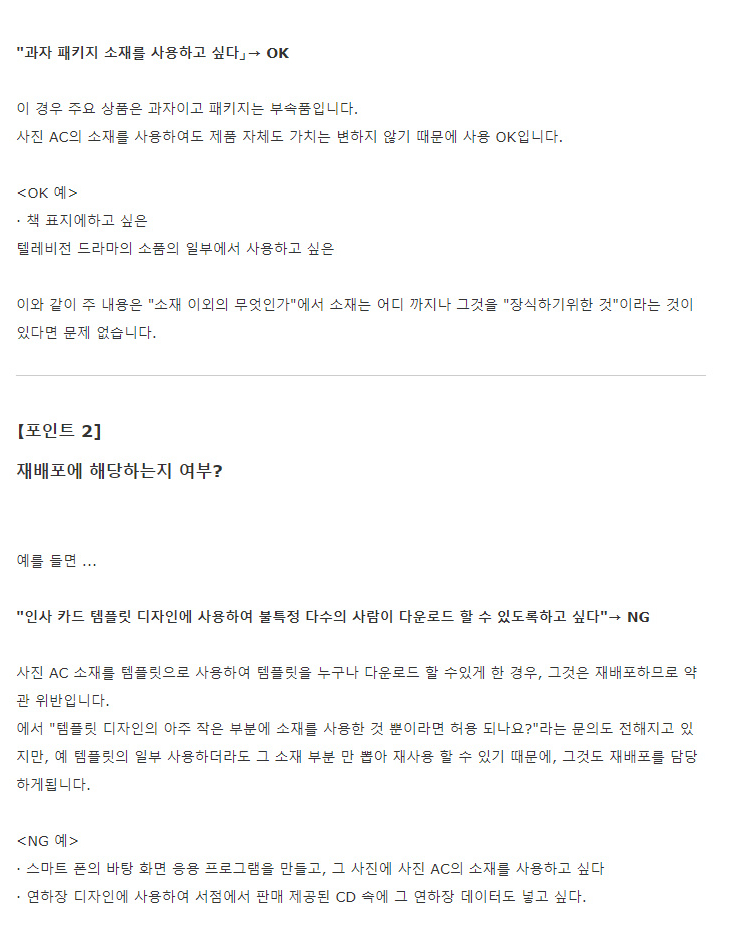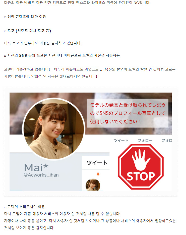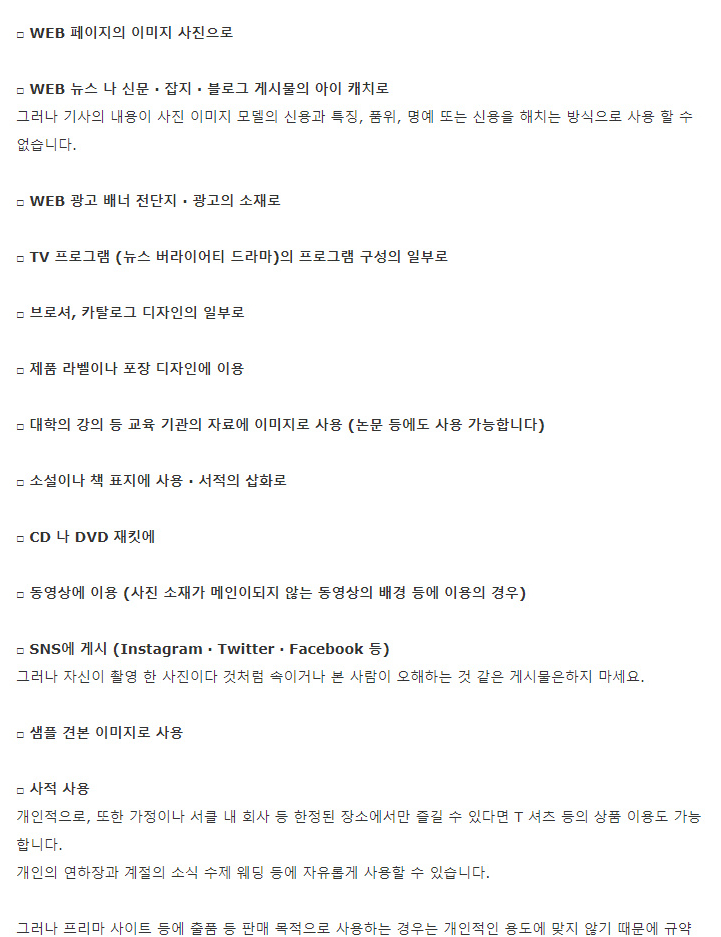 가능한 경우를 보면 SNS에 게시가 가능하기 때문에 블로그는 편하게 사용하셔도 됩니다. 안되는 경우를 보면 성인 콘텐츠, 회사 로고, SNS 등의 프로필 사진이나 아이콘을 모델의 사진으로 사용하는 경우인 경우 안됩니다.