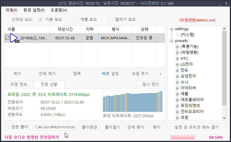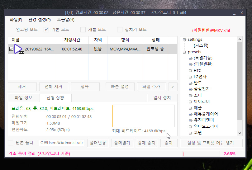 3. 샤나인코더에서 H264 비트레이트 5000으로 인코딩입니다.