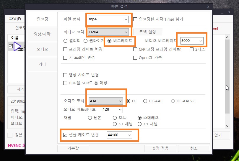2. 샤나인코더에서 H264 비트레이트 3000으로 인코딩입니다.