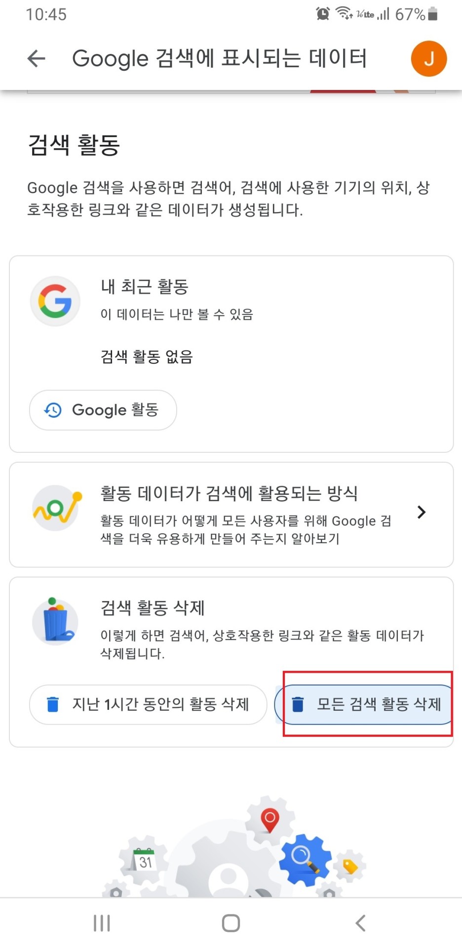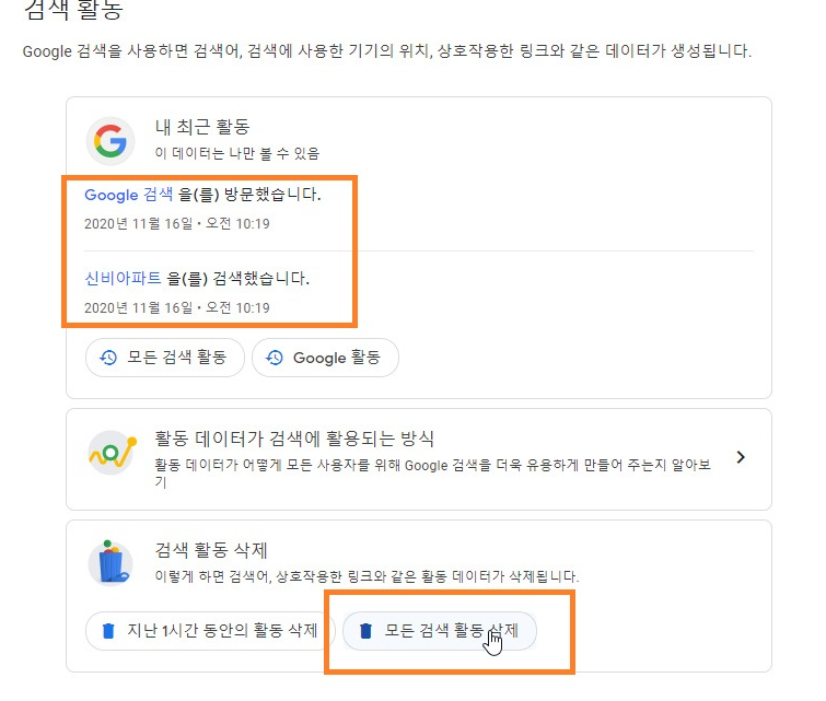 2. 검색 활동에서 모든 검색 활동 삭제 눌러주시면 됩니다.