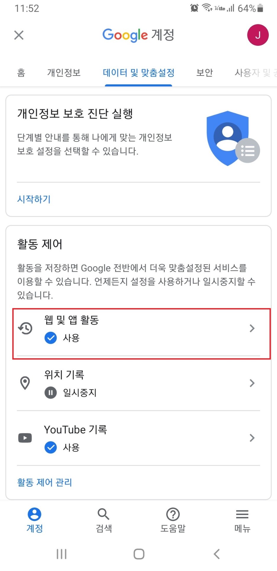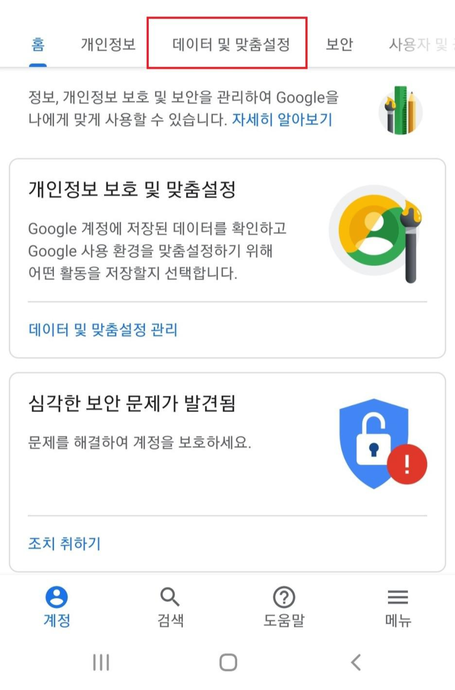 2. Google 계정 관리 > 데이터 및 맞춤 설정으로 들어갑니다.