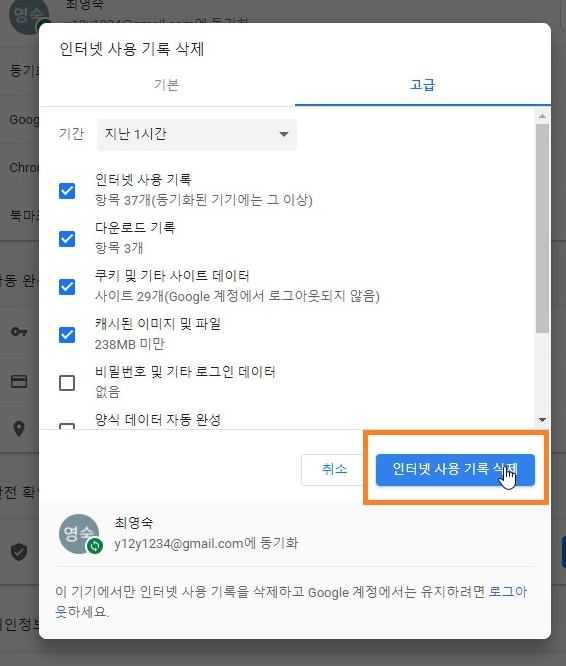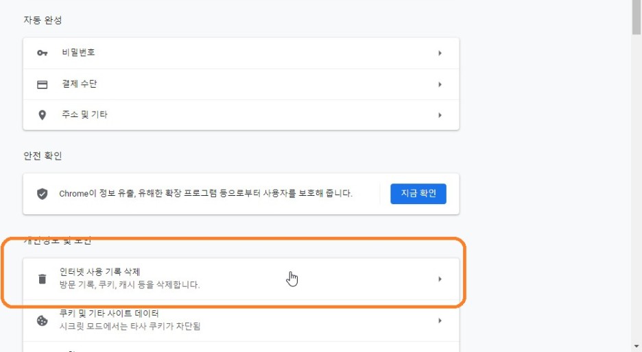 3. 여기서 더 확실하게 삭제하기 위하여 인터넷 사용 기록 삭제를 합니다.