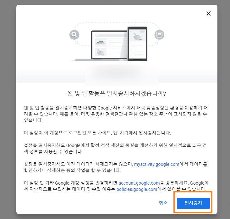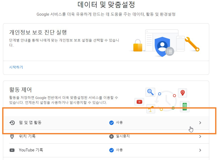 2. 데이터 및 맞춤 설정에서 웹 및 앱 활동을 클릭하신 다음 일시 중지를 클릭하시면 더 이상 검색어가 저장이 되지가 않고 표시도 되지 않게 됩니다.