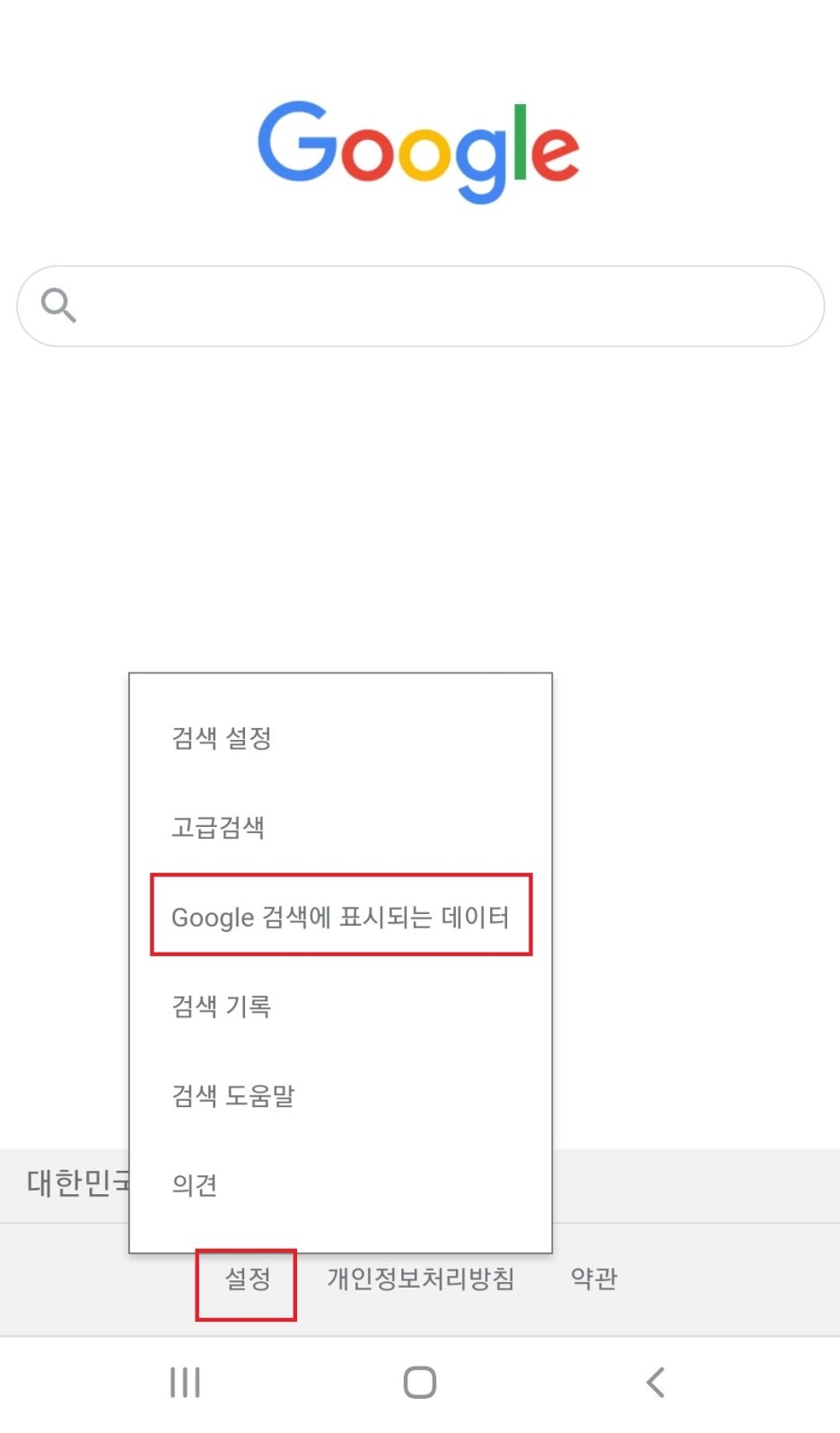 1. 구글 하단에 설정 > Google 검색에 표시되는 데이터 클릭합니다.
