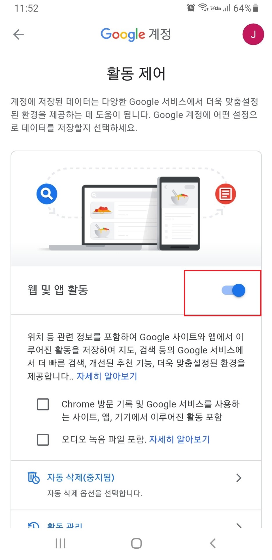 3. 활동 제어에서 웹 및 앱 활동에서 체크 해제해 주시면 되겠습니다.