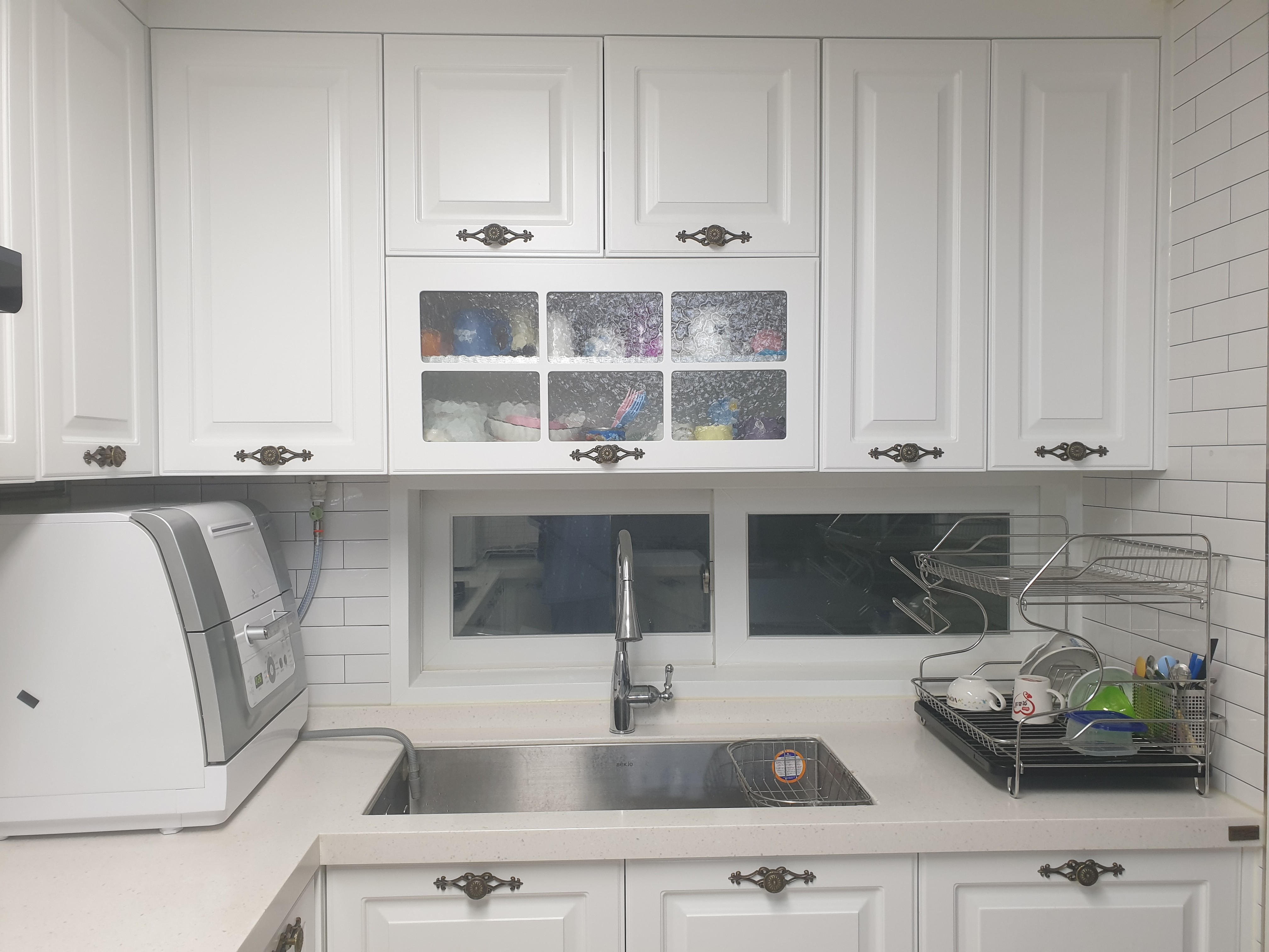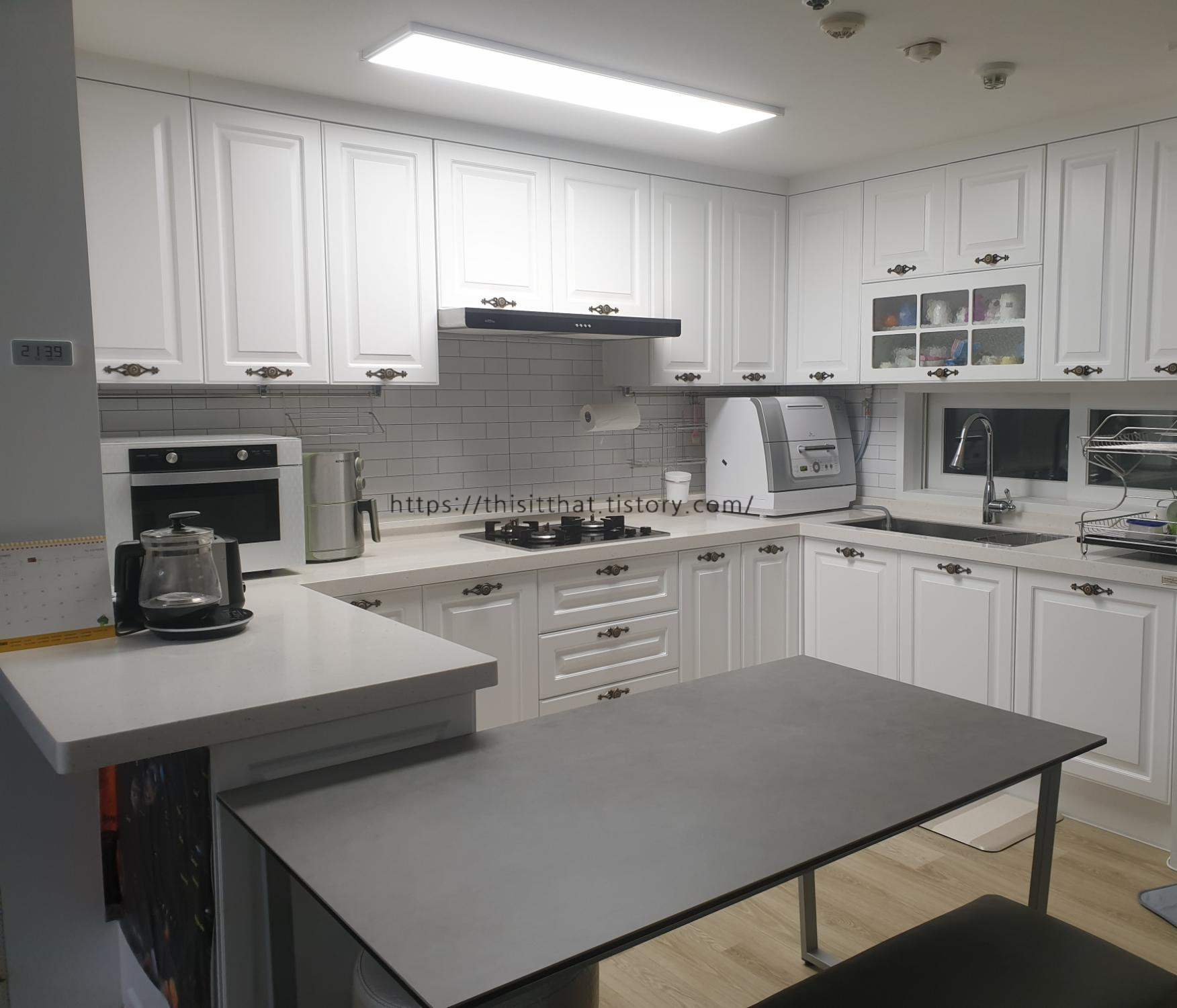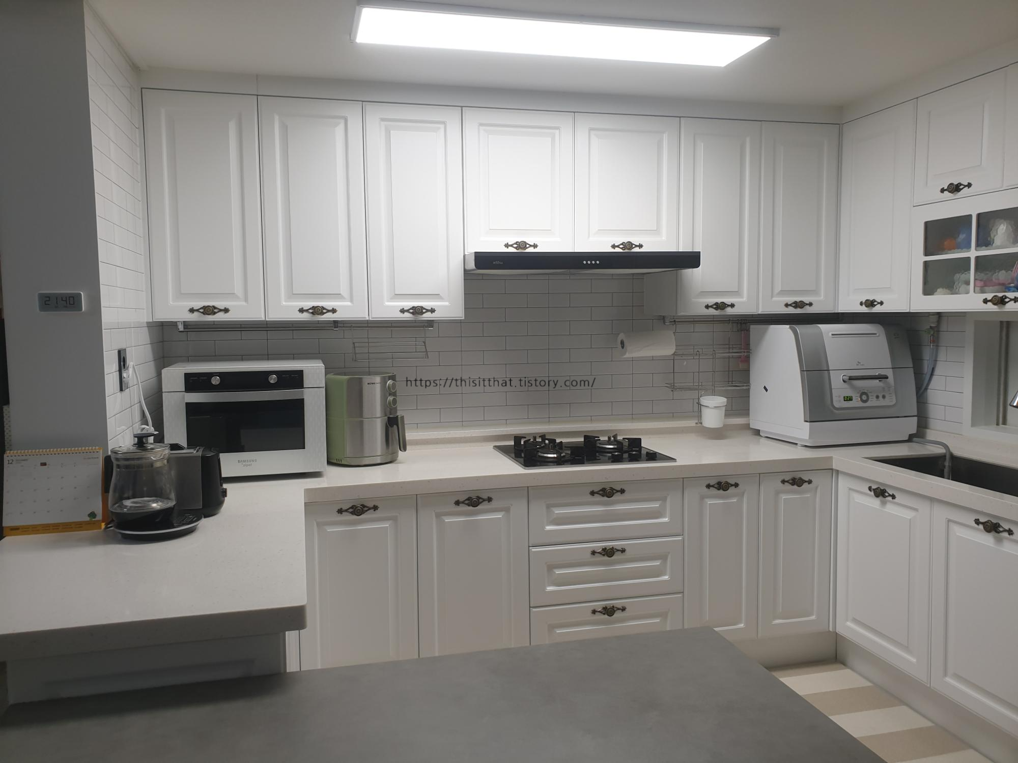 식기세척기는 하부장에 빌트인으로 하려고 했지만 허리를 숙여서 넣고 빼고 하는 게 힘들 거 같아서 위로 올려서 사용하는 게 좋지 않을까 하고 몇 날 며칠은 고민하다가 결국 위로 올려서 사용하고 있습니다만 6인 식기세척기지만 저희 가족 3인용으로 쓰기에 적당합니다. 가족이 4인 이상이거나 손님이 자주 온다면 하부장에 빌트인 식기세척기로 해야 할듯합니다.